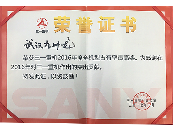 三一重機(jī)2016年度全機(jī)型占有率最高獎(jiǎng)