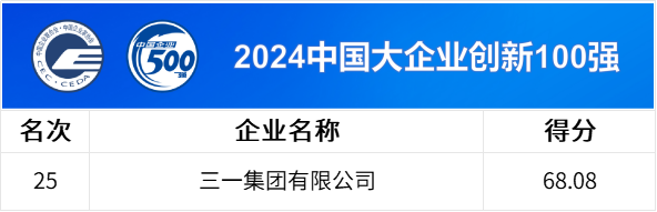 “2024中國大企業(yè)創(chuàng)新100強(qiáng)”依據(jù)對2023年企業(yè)研發(fā)投入強(qiáng)度、研發(fā)費(fèi)用、發(fā)明專利數(shù)、非發(fā)明專利數(shù)、收入利潤率等作為評價(jià)指標(biāo)計(jì)算綜合得分排序產(chǎn)生。三一集團(tuán)始終將研發(fā)創(chuàng)新視為事業(yè)發(fā)展的第一推動力,研發(fā)投入大、創(chuàng)新成果豐碩,在榜單中位列第25名。