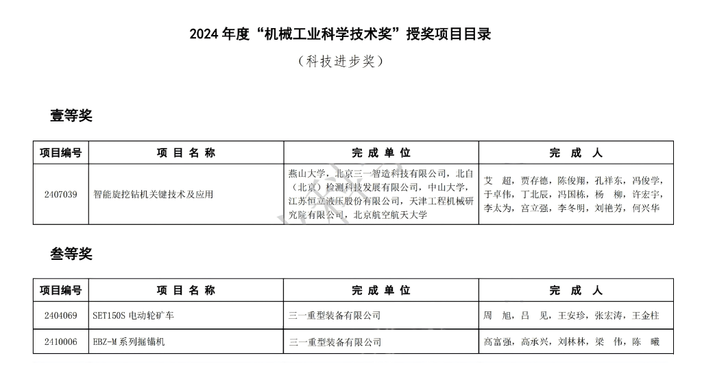 北京三一智造科技有限公司“智能旋挖鉆機(jī)關(guān)鍵技術(shù)及應(yīng)用”項(xiàng)目榮獲科技進(jìn)步獎(jiǎng)一等獎(jiǎng);三一重型裝備有限公司“SET150S電動(dòng)輪礦車(chē)”項(xiàng)目、“EBZ-M系列掘錨機(jī)”項(xiàng)目榮獲科技進(jìn)步獎(jiǎng)三等獎(jiǎng)。